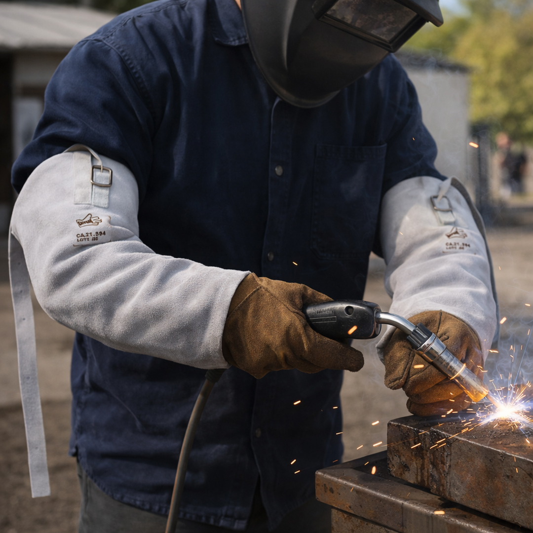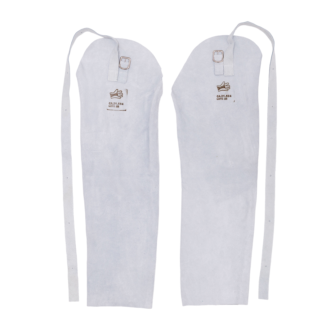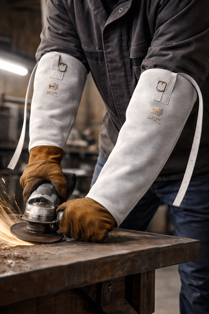 Mangote de segurança confeccionado em raspa de couro bovino, destinado à proteção dos braços e antebraços contra abrasão, fagulhas e respingos de solda. Possui sistema de ajuste por fivela, permitindo melhor fixação ao braço do usuário e reduzindo deslocamentos durante o uso. Apresenta construção robusta, com costuras reforçadas, sendo indicado para uso profissional em ambientes industriais, caldeiraria e manutenção, desde que não haja exposição direta e contínua a chamas intensas ou calor extremo.